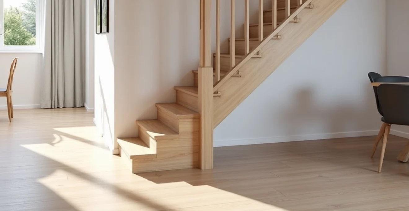 Ce type d’escalier est particulièrement adapté aux petites maisons où l’espace mural est limité. Il peut être installé dans un coin, libérant ainsi le centre de la pièce pour d’autres usages. La partie droite initiale facilite également le transport d’objets volumineux.